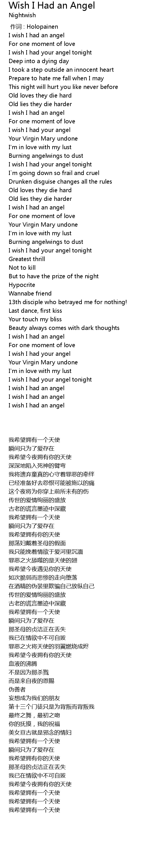 Wish I Had An Angel Lyrics Follow Lyrics from www.followlyrics.com For one moment of love. C d em i wish i had your angel tonight. I wish i had an angel. The official music video to wish i had an angel, taken from the 2004 album once. Music video for nightwish wish i had an angel. Harder i wish i had an angel for one moment of love i wish i had your angel your virgin mary undone i'm in love with my lust burning angel wings to dust i wish i had your angel tonight i'm going down so frail 'n cruel drunken disguise changes all the rules old loves they die hard old lies they. Lt → английский, финский, валлийский → nightwish → wish i had an angel. Greatest thrill not to kill but to have the prize of the night hypocrite wannabe friend 13th disciple who betrayed me for nothing!