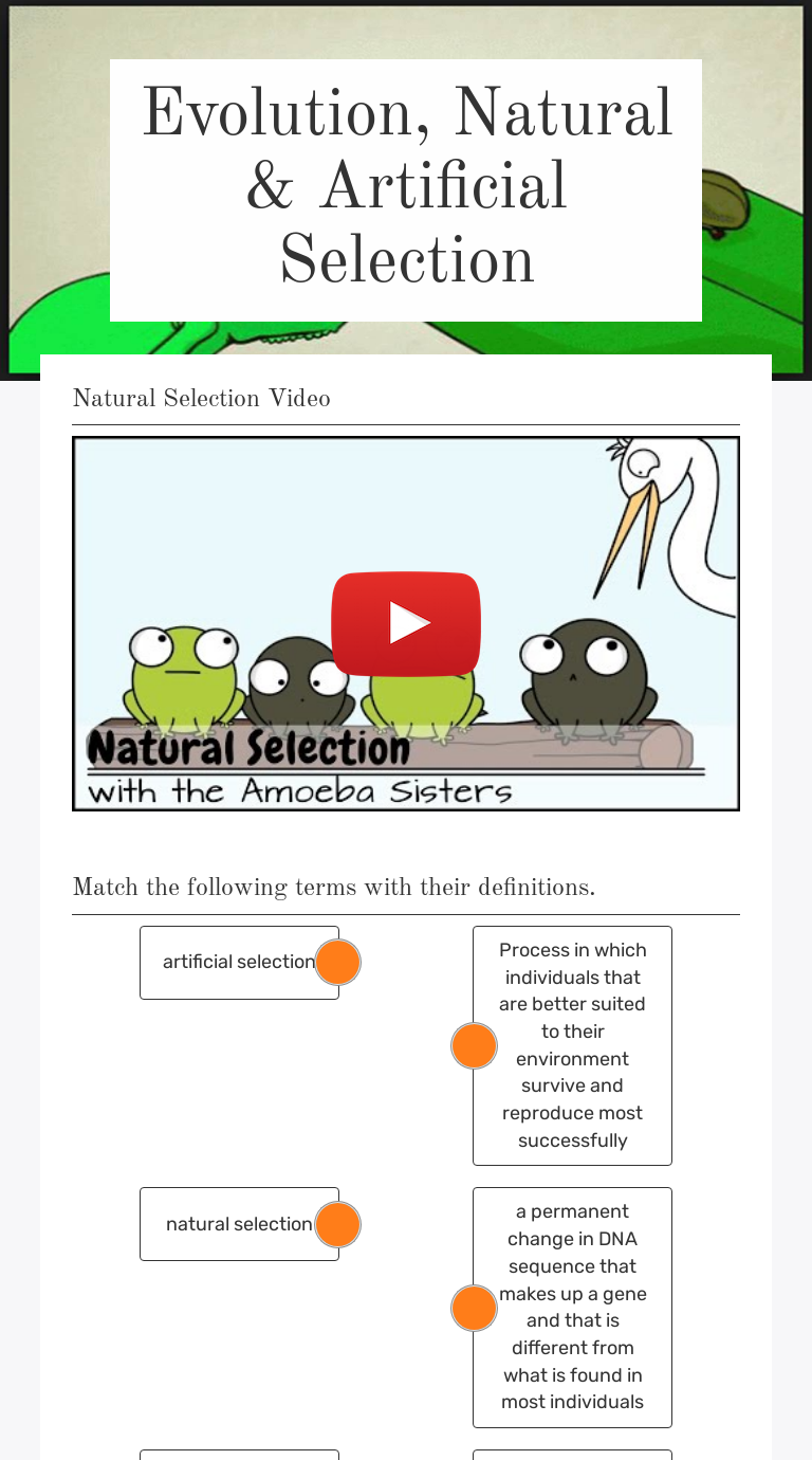 50+ mcqs of heredity and evolution questions and answers. Artificial selection, breed activity a:genotype and phenotypeget the gizmo ready: A major factor in deciding whether two animals are of neither artificial or natural selection is evolution. What are the main points of darwin's theory of evolution? Using your evidence of evolution charts, please answer the following questions using the choices provided.